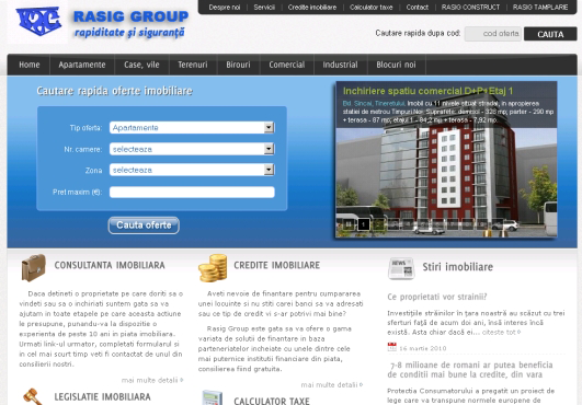 Real estate company website, 3rd version, online from October 2009. Features: offers listings with advanced faceted search engine, pagination and photo gallery, javascript taxes calculators, flash animated logo, flash banner rotator using XML data...