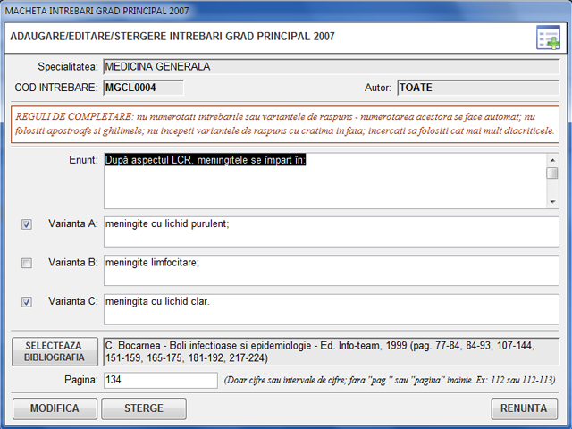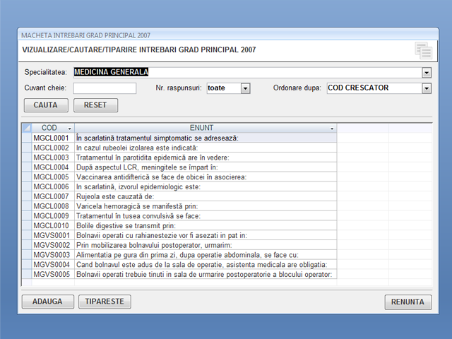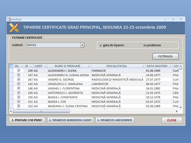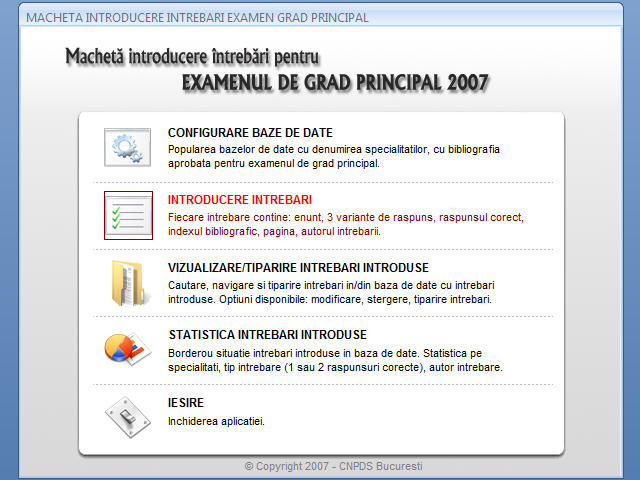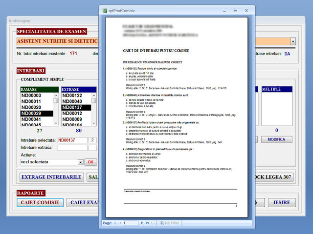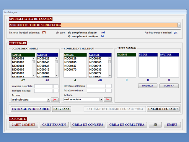 Modules: multiple choice questions database management (collect, unify and validate), questions random draw for exam module (drawing, committee notebook, exam sheet and answer sheet print), candidates database management, diplomas printing module (including duplicates printing starting with 2003).